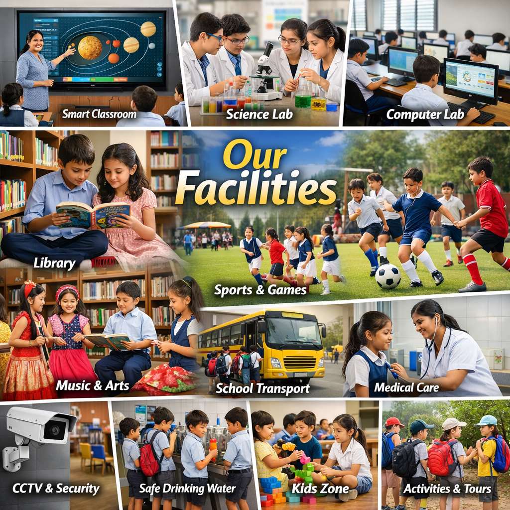The school provides a safe and reliable transport facility covering nearby areas. All buses follow safety guidelines and are managed by trained drivers and staff.
